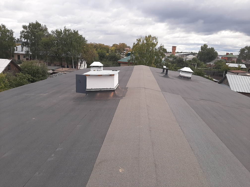 Подрядчик разобрал старую крышу, провел ремонт цементно-песчаной стяжки, устройство пароизоляции, а также работы по устройству нового покрытия кровли. Кроме того, специалистами были восстановлены вентшахты, их оштукатурили и покрасили.