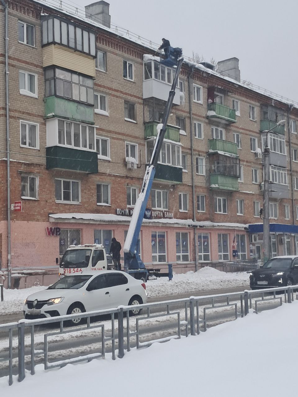 Снимки, сделанные около трех часов дня, показывают, что на месте происшествия работает спецтехника: к зданию подъехала машина с краном, с помощью которой специалисты поднимаются на уровень крыши. Сейчас они очищают снег с козырька застекленного балкона на верхнем этаже дома. Территория вокруг места происшествия уже огорожена сигнальной лентой.