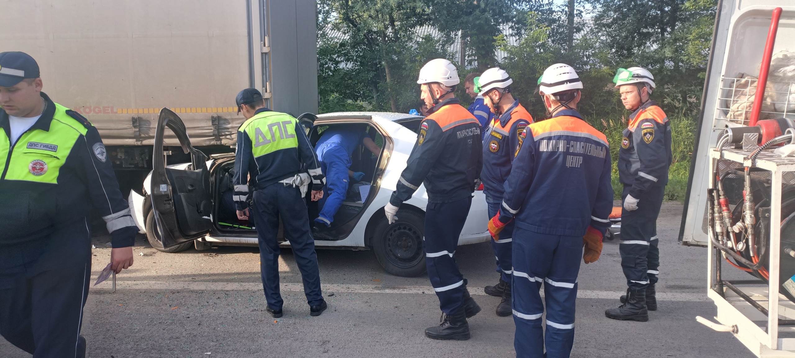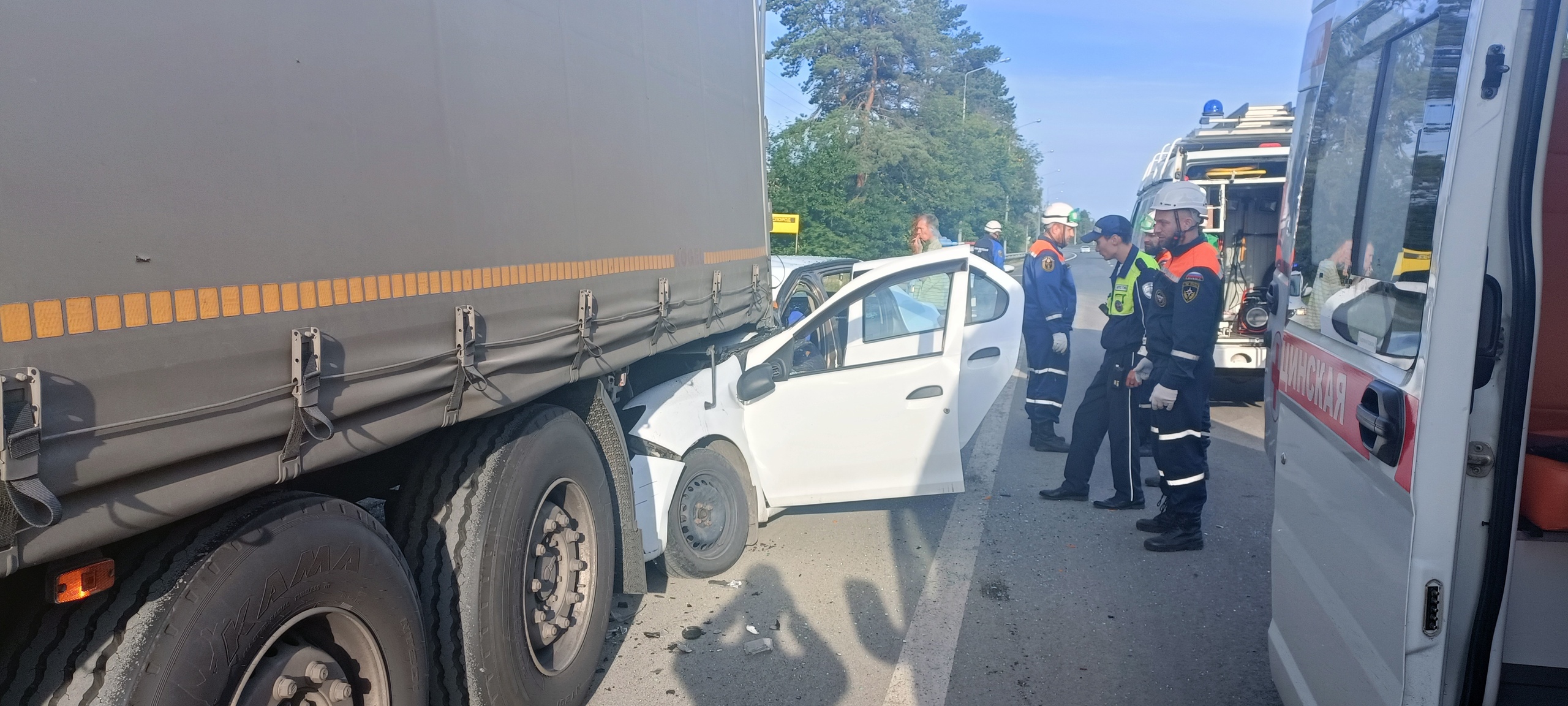 На кадрах, опубликованных спасателями, видно, как легковой автомобиль буквально ушел под заднюю часть грузовика. На снимки попали: разбитая машина, скорая помощь, сотрудники экстренных служб и человек на носилках – все это подчеркивает масштабы трагедии.
