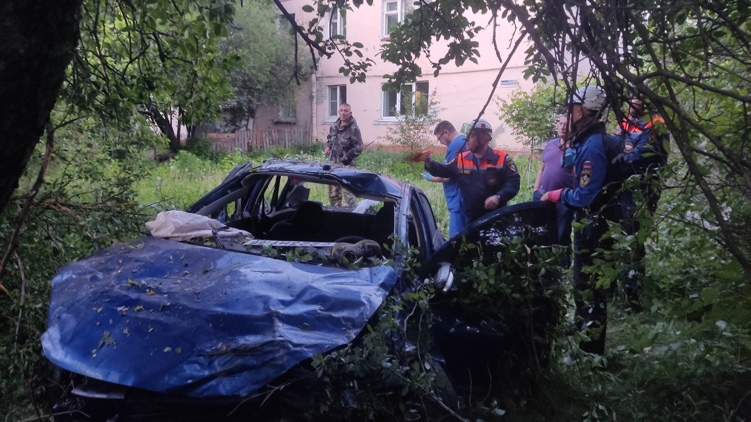 Фотографии, опубликованные «пожарно-спасательным центром», наглядно демонстрируют силу удара: одна из машин после столкновения вылетела с дороги и врезалась в дерево буквально под окнами многоквартирного дома. Автомобиль оказался сильно поврежден – выбито лобовое стекло, смята передняя часть кузова.