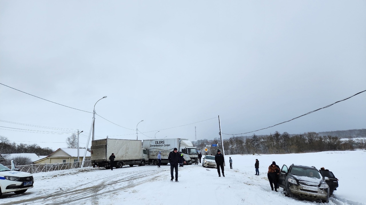 В социальной сети во «ВКонтакте» в сообществе автолюбителей появились кадры с места происшествия. На снимках видно, что произошло столкновение двух грузовых авто и легковой иномарки. У легковушки видны серьезные повреждения.