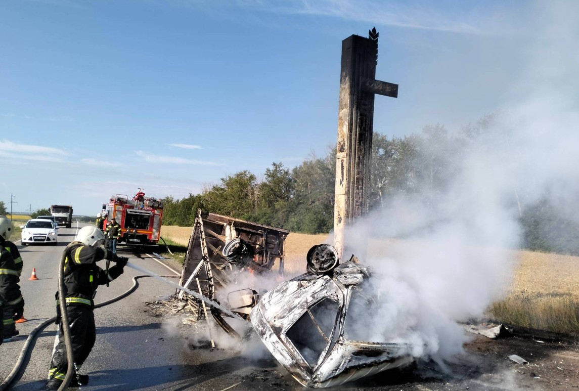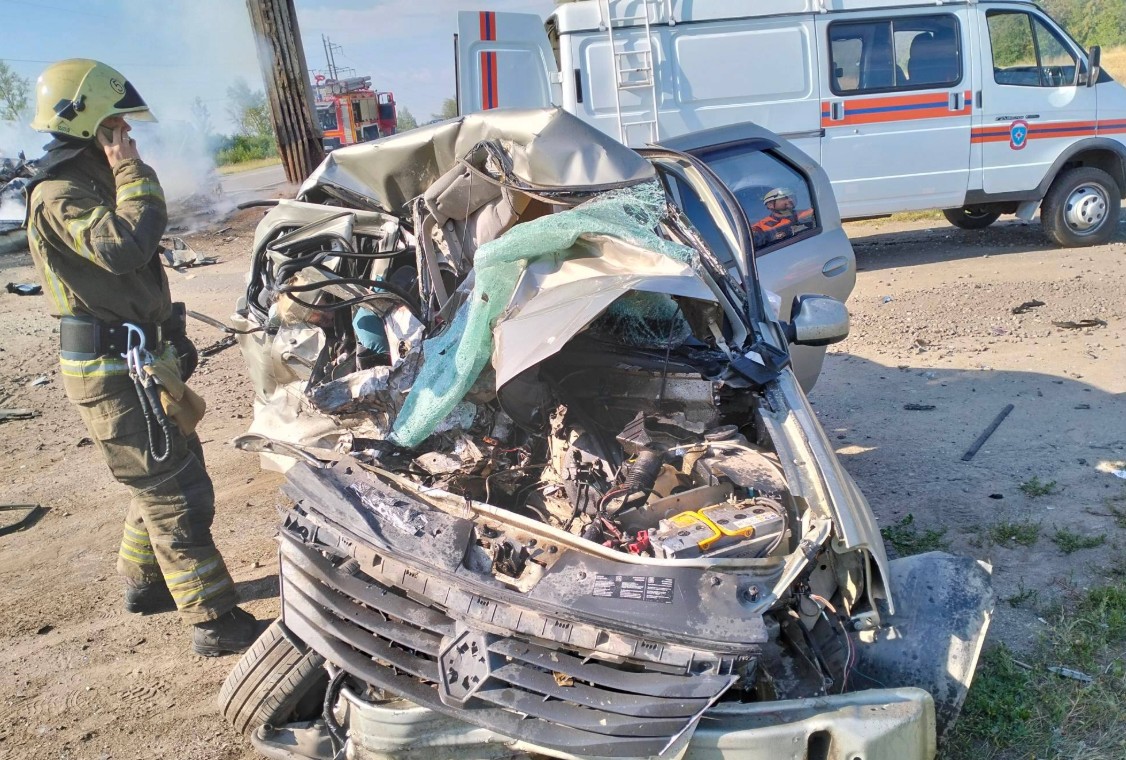Появились новые фото с места трагедии, которые красноречиво говорят о силе столкновения. Легковой автомобиль Renault Logan буквально смяло от удара.