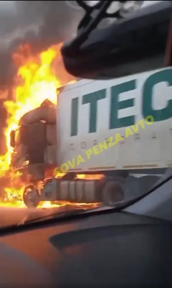 В соцсети один из очевидцев опубликовал видео, на котором видно фуру, стоящую на обочине. У машины открытым огнем полыхает кабина.