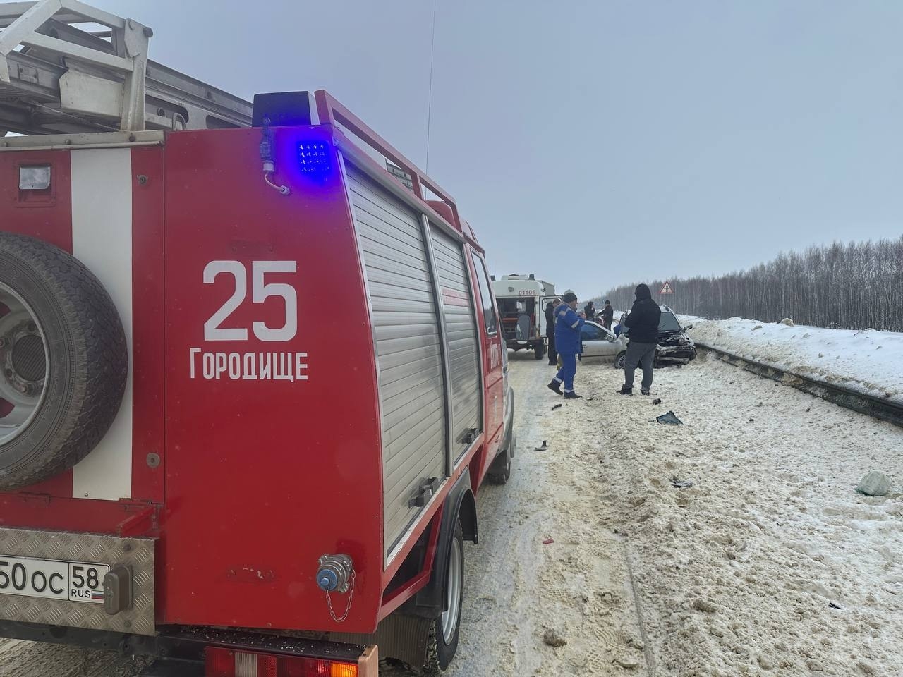 В соцсетях появились кадры с места жесткой аварии, произошедшей на федеральной трассе М-5 «Урал» в Пензенской области. Фотографии опубликовало МКУ Городищенского района «Служба спасения».