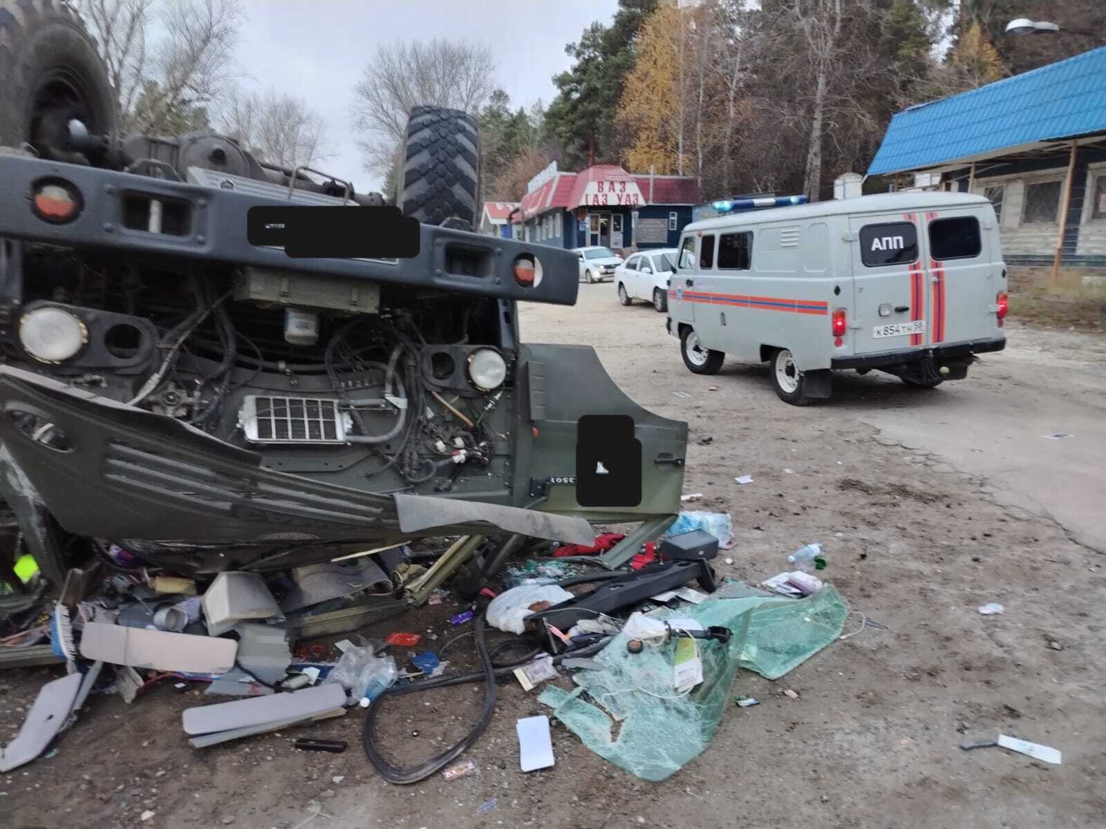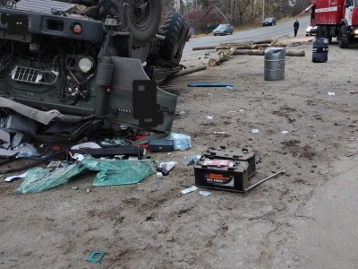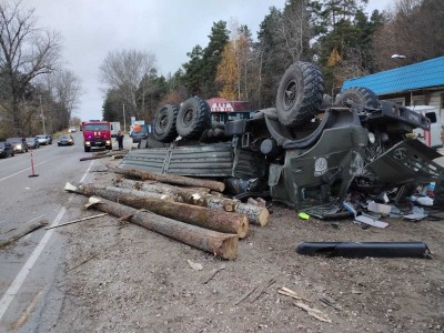 На фото видно, как на дороге лежит перевернутый грузовик, из кузова которого рассыпались тяжелые бревна. Кабина и корпус автомобиля смяты до неузнаваемости. Рядом – спецтехника пожарных и спасателей, прибывших на место происшествия.