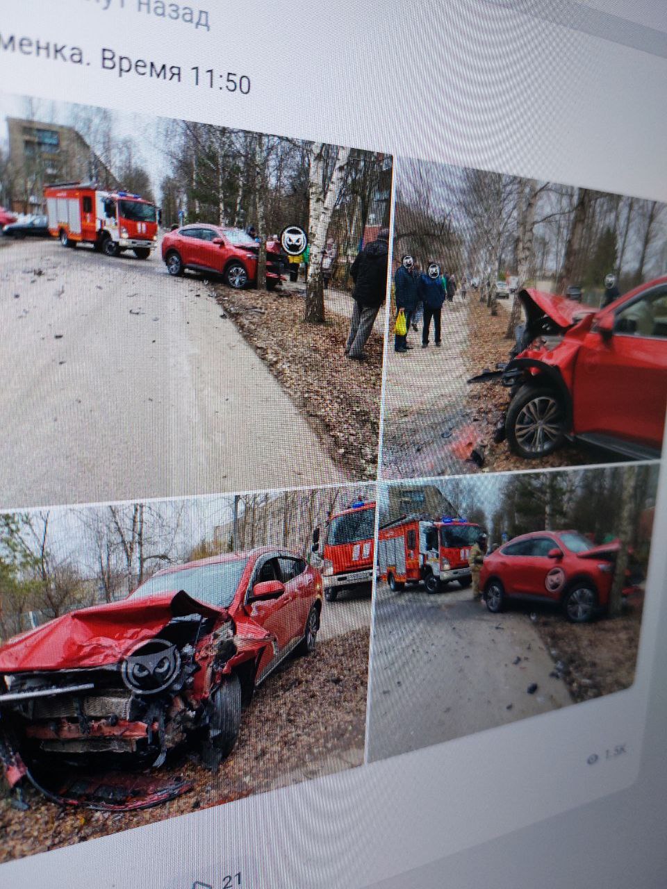 На фото также можно заметить машину пожарных и спасателей, которые перекрыли автодорогу, усыпанную обломками авто.