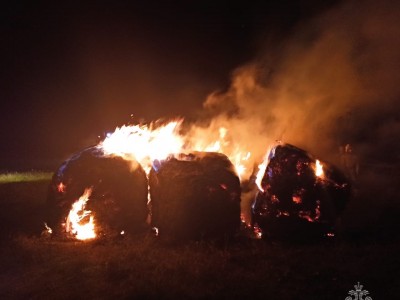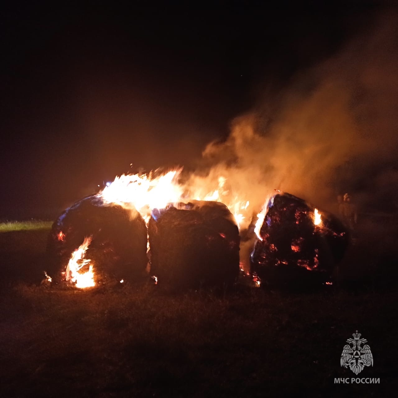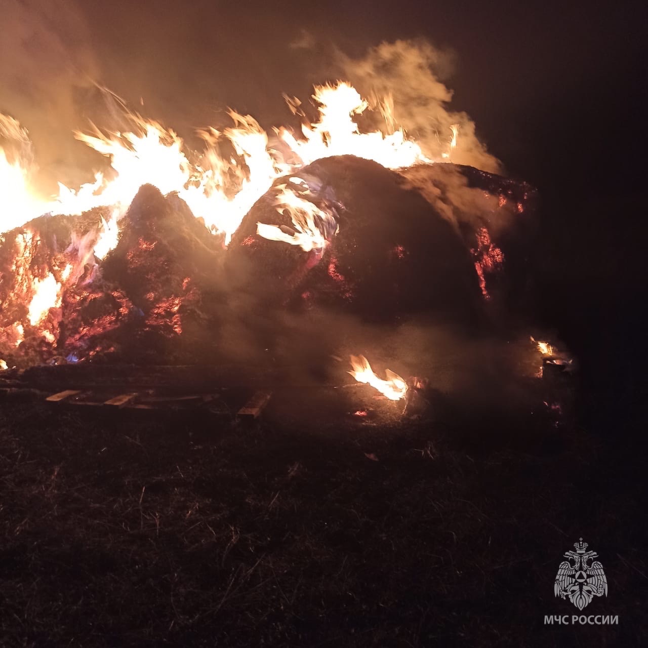 Огонь вспыхнул около половины десятого вечера на улице Октябрьская. Пламя охватило девять тюков с сеном на площади 50 квадратных метров.