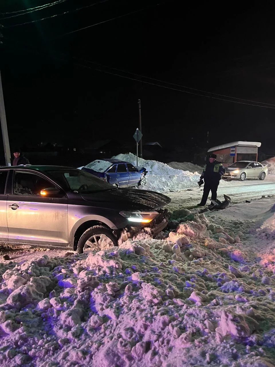 На кадрах видно, как одна из легковушек оказалась в сугробе за пределами проезжей части – у автомобиля сильно повреждена передняя часть. Рядом запечатлен еще один легковой автомобиль, также съехавший с дороги и получивший механические повреждения. Судя по снимкам, на месте работала спецтехника пожарно-спасательных подразделений.