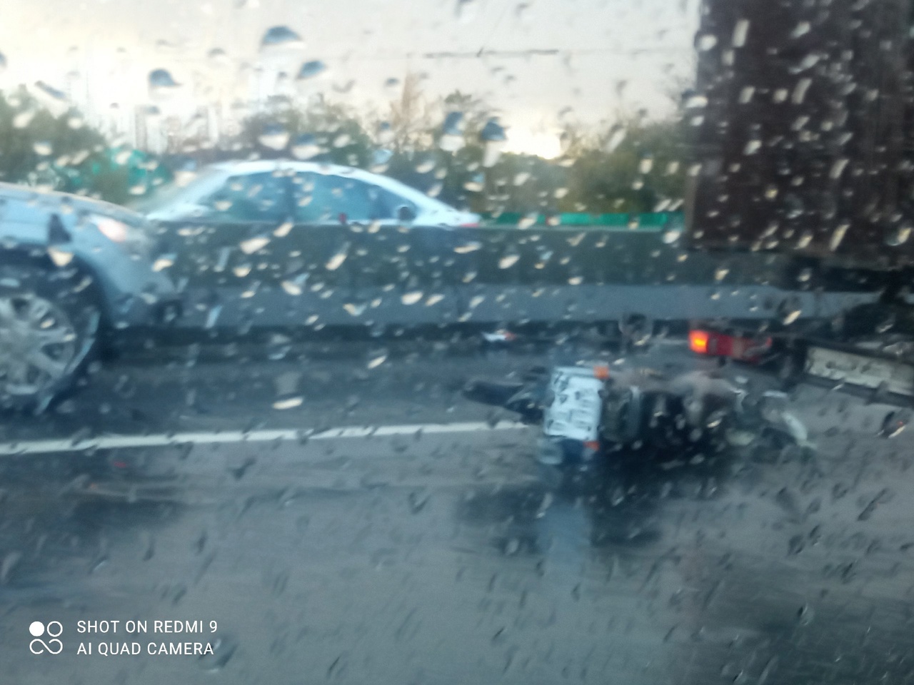 В сети появилось несколько видео, на которых видно человека, распластавшегося на проезжей части. В нескольких метрах от него под большегрузом оказался мотоцикл.