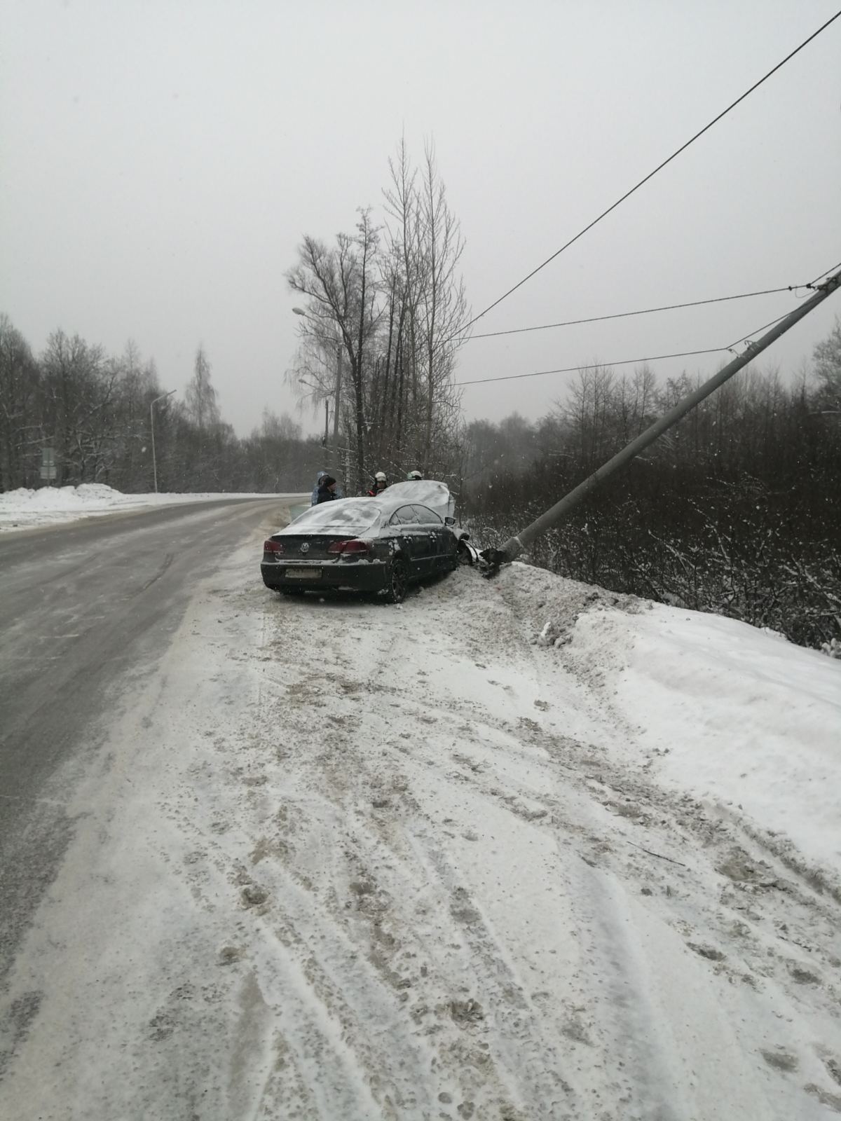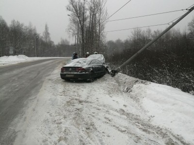 Авария случилась около половины девятого утра в районе улицы Чаадаева, 165. Иномарка врезалась в опору ЛЭП, в результате столб накренился, он явно упал бы, но его удержали провода электропередач.