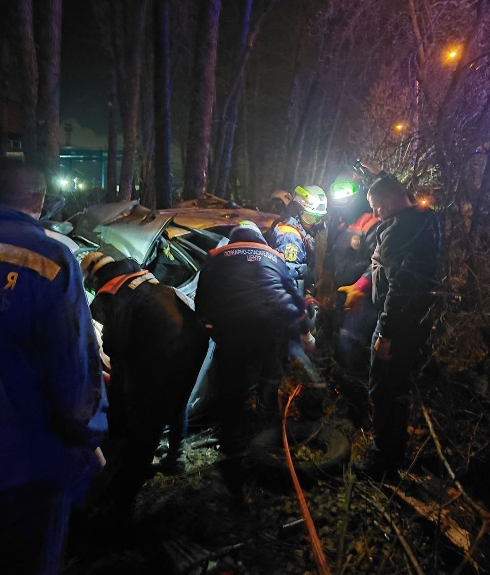 Как сообщили в ведомстве, сигнал о происшествии поступил в 21:23 от оперативного дежурного службы «01». По предварительной информации, водитель легковушки не справился с управлением, машина съехала с дороги и оказалась зажатой в зарослях за пределами проезжей части. Один из пассажиров оказался заблокирован в салоне.