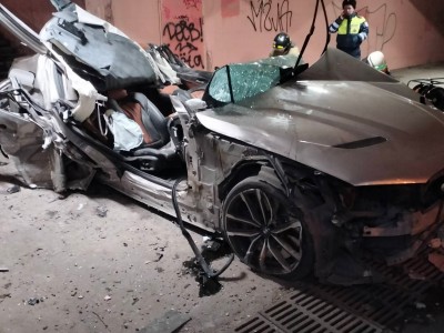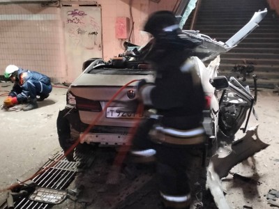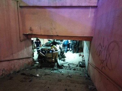 Авария случилась в районе дома №31а около десяти часов вечера. Из-за столкновения двух авто, одна из машин скатилась в подземный пешеходный переход. От удара легковушку серьезно искорежило, у нее оторвало крышу. Внутри машины при этом застрял раненый человек.