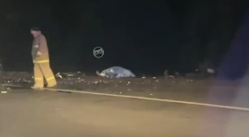 На кадрах запечатлены страшные последствия столкновения двух легковых автомобилей. Один из них находится на обочине, другой – за пределами проезжей части. Подписчик группы запечатлел лежащее вдоль дороги тело, покрытое материалом.