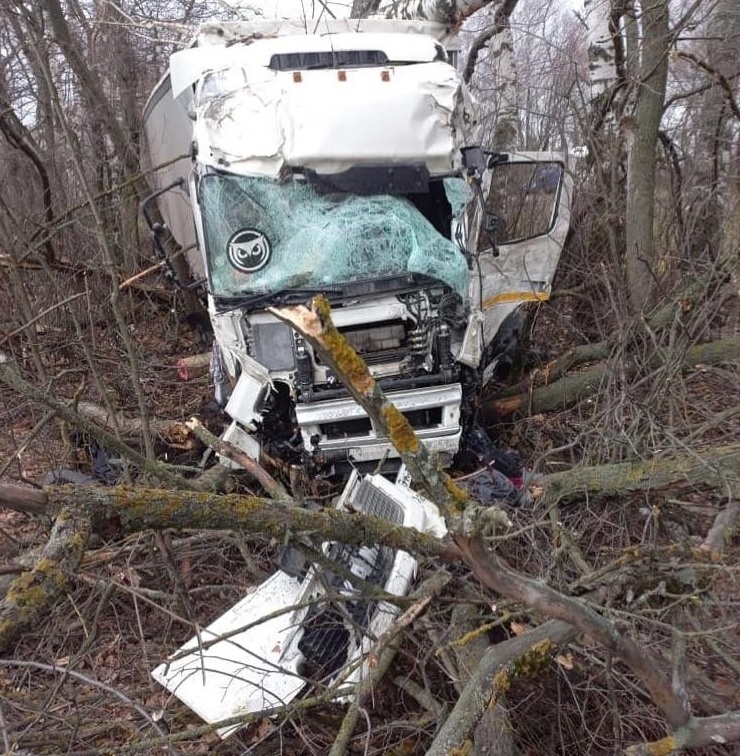 На кадрах машина находится далеко от обочины посреди посадок. Вокруг нее поломанные деревья, лобовое стекло разбито вдребезги, передняя часть тягача сильно повреждена.