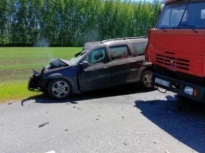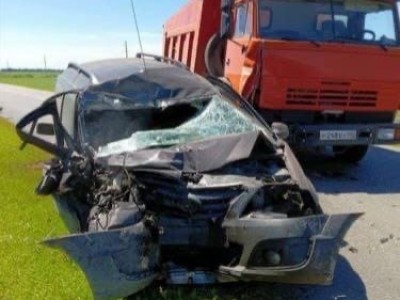 На снимках видно легковушку с раскуроченным передом и разбитым лобовым стеклом. Неподалеку от нее остановился КамАЗ, у которого можно заметить небольшую вмятину сбоку.