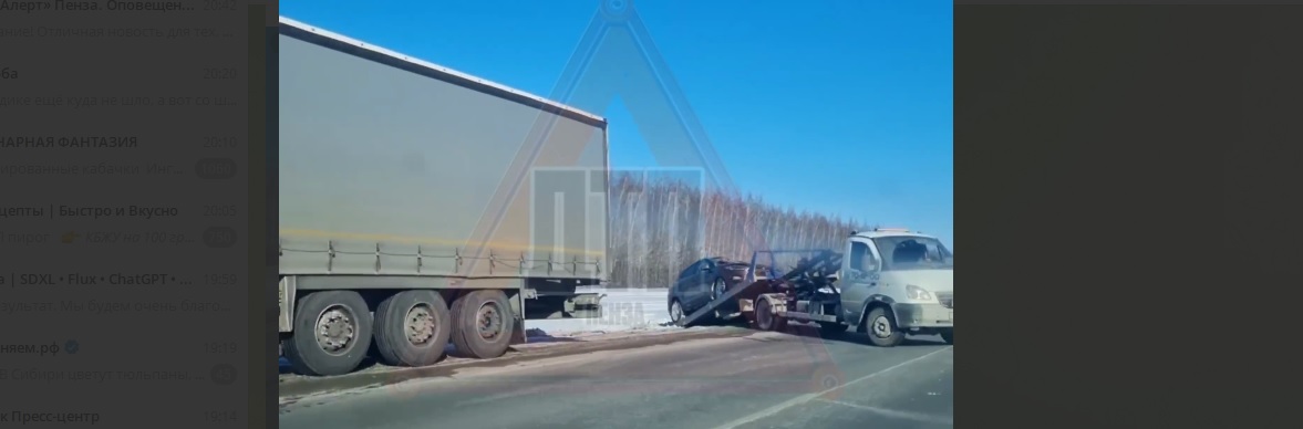 На автодороге «Пенза — Тамбов» водитель автомобиля «Хендай» вылетел с трассы. Вытащить его смог погрузчик. Рядом на обочине видно фуру.