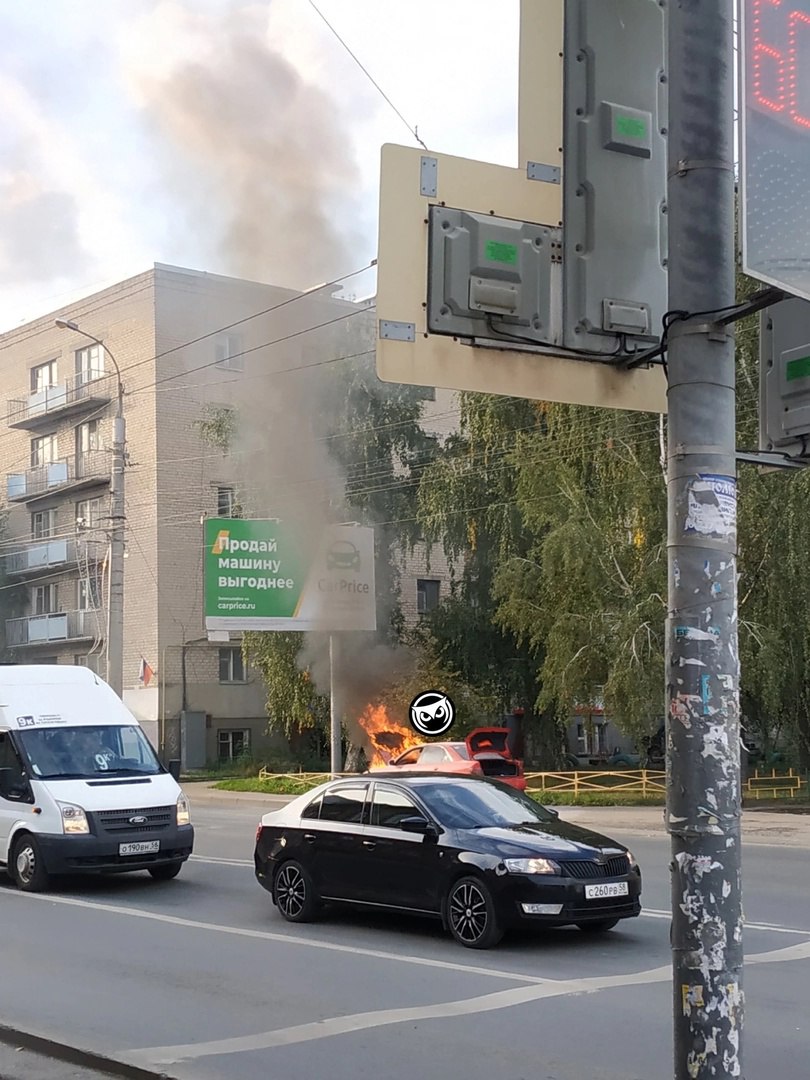 На опубликованных снимках видно, как припарковынный красный автомобиль охвачен пламенем. По округе разносится черный дым.