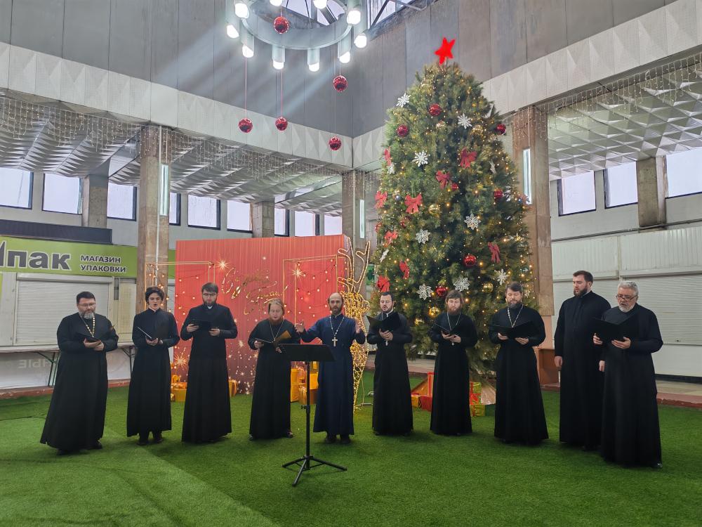 В необычной обстановке - крытом павильоне Центрального рынка и торговом центре Пензы на улице Московской - прозвучали рождественские песнопения в исполнении хора духовенства Пензенской епархии.