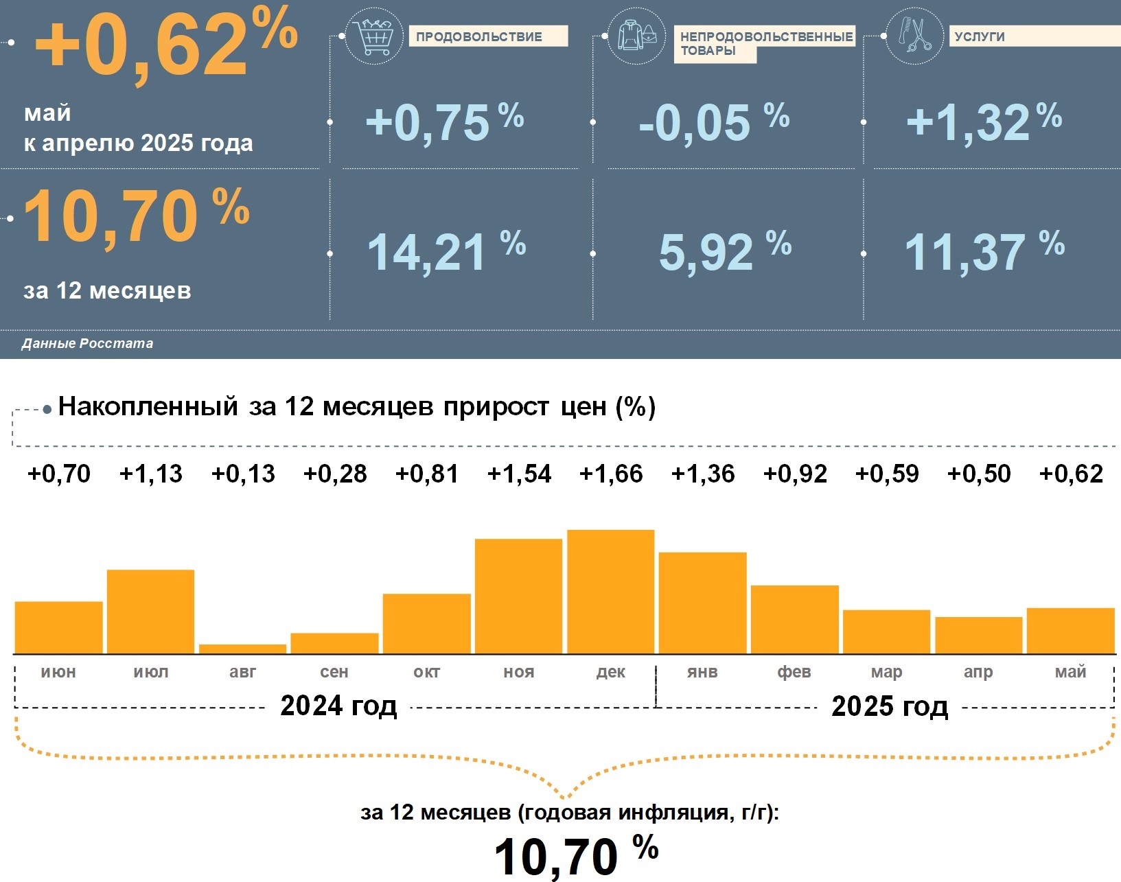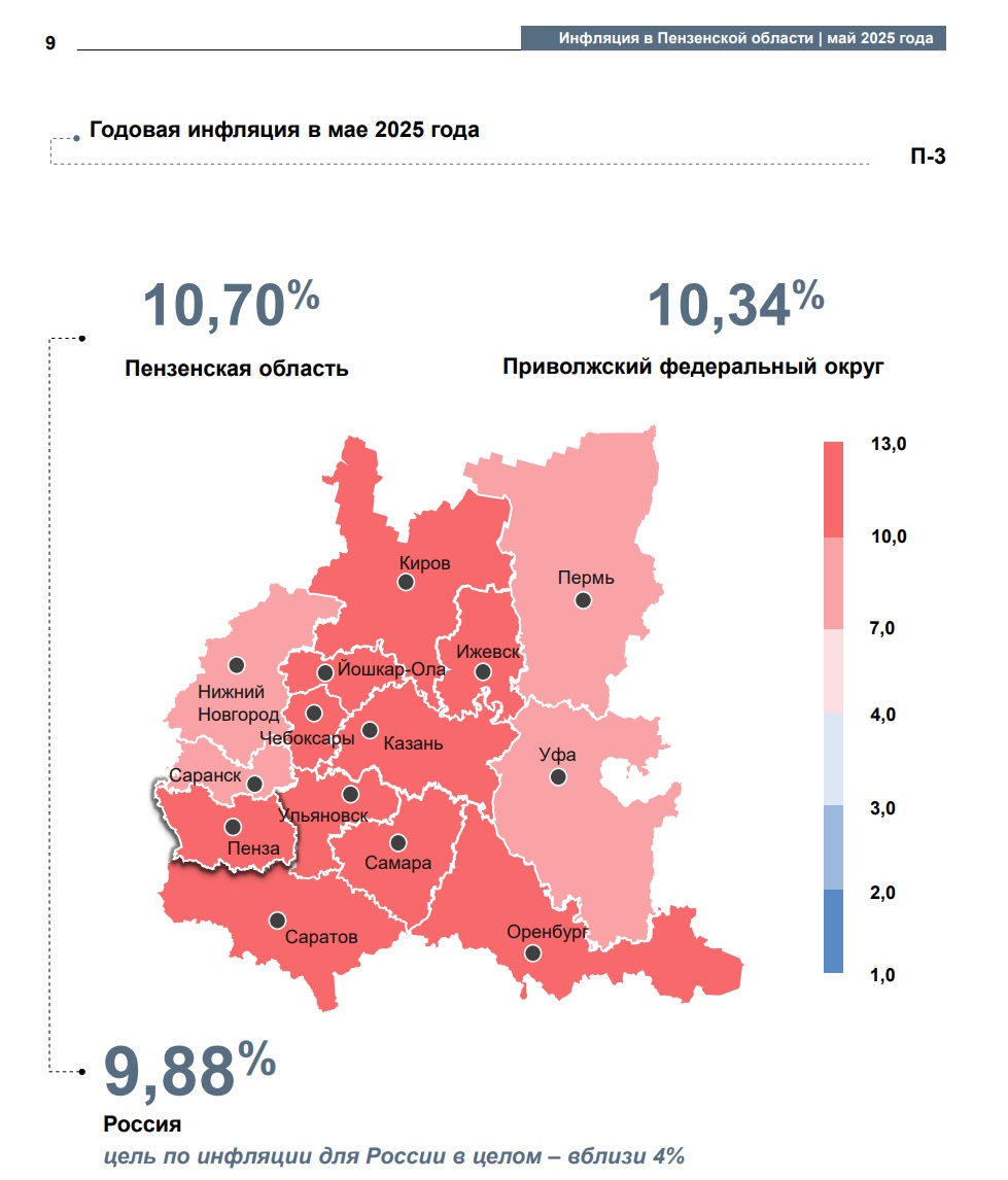 Отделение Банка России по Пензенской области опубликовало данные об инфляции за май 2025 года. Согласно информации Росстата, потребительские цены в регионе выросли на 0,62% по сравнению с апрелем, а годовая инфляция составила 10,70%, что заметно выше общероссийского уровня – 9,88%.