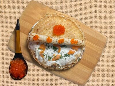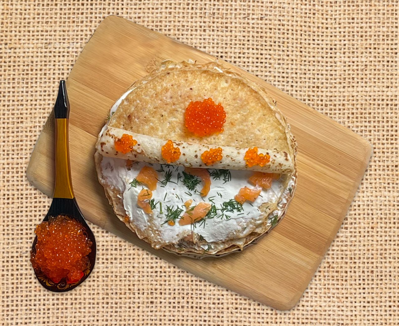 Блинчики с благородной форелью, сочным мясом, ветчиной и сыром, нежной курицей с грибами или классическим сочетанием яйца и зеленого лука.