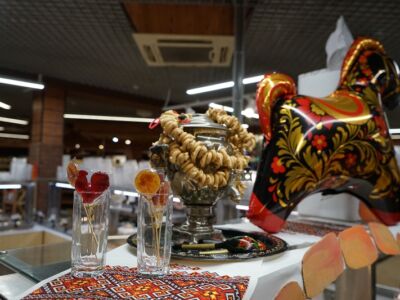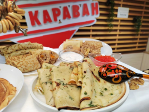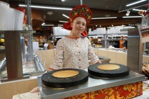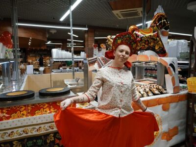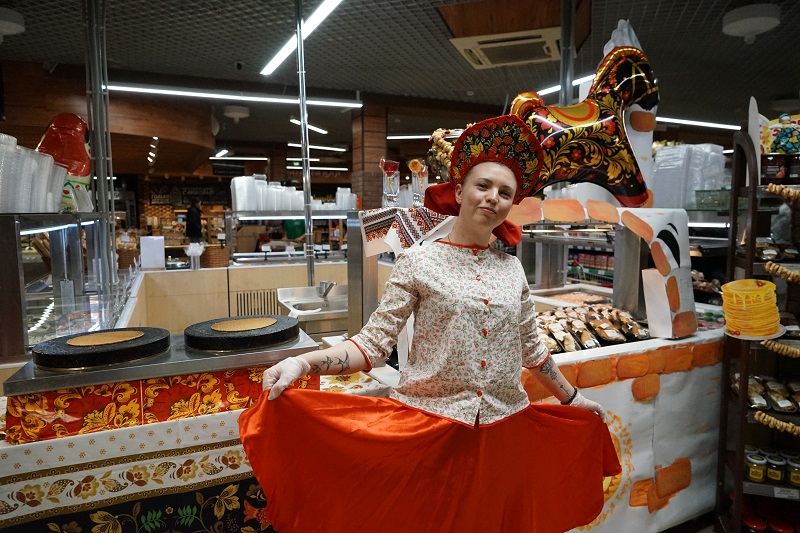 Главная особенность праздника в «Караване» — полная открытость процесса. Специальные плиты и тематические стенды установлены прямо в залах: золотистые блинчики выпекают на глазах у покупателей. Аромат свежего теста и пышущий жар от сковородок не оставляют шансов пройти мимо.