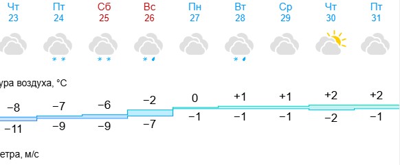 Уже завтра, 23 января, морозы начнут сдавать свои позиции. Днем ожидается -8 градусов, а к выходным температура продолжит плавно подниматься: -7 градусов в пятницу, -6 в субботу и всего -2 в воскресенье.