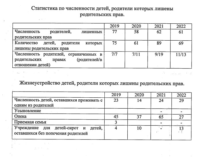 Фактов отобрания детей у родителей в 2022 году не зарегистрировано. Однако 61 родитель был лишен родительских прав в отношении 69 детей.