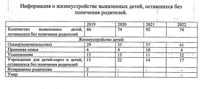 В 2022 году в статусе «детей-сирот» и «детей, оставшихся без попечения родителей» было выявлено 74 ребенка, из них 17 ребят отправили в учреждения для данных категорий граждан (6 человек устроены в пензенский дом ребенка в Кузнецка, а 11 — в спасский детский дом).