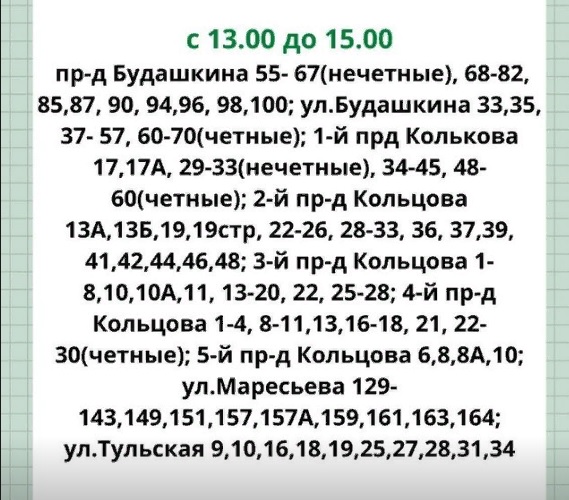 Так, с 9:50 до 12:00 света не будет по следующим адресам:
