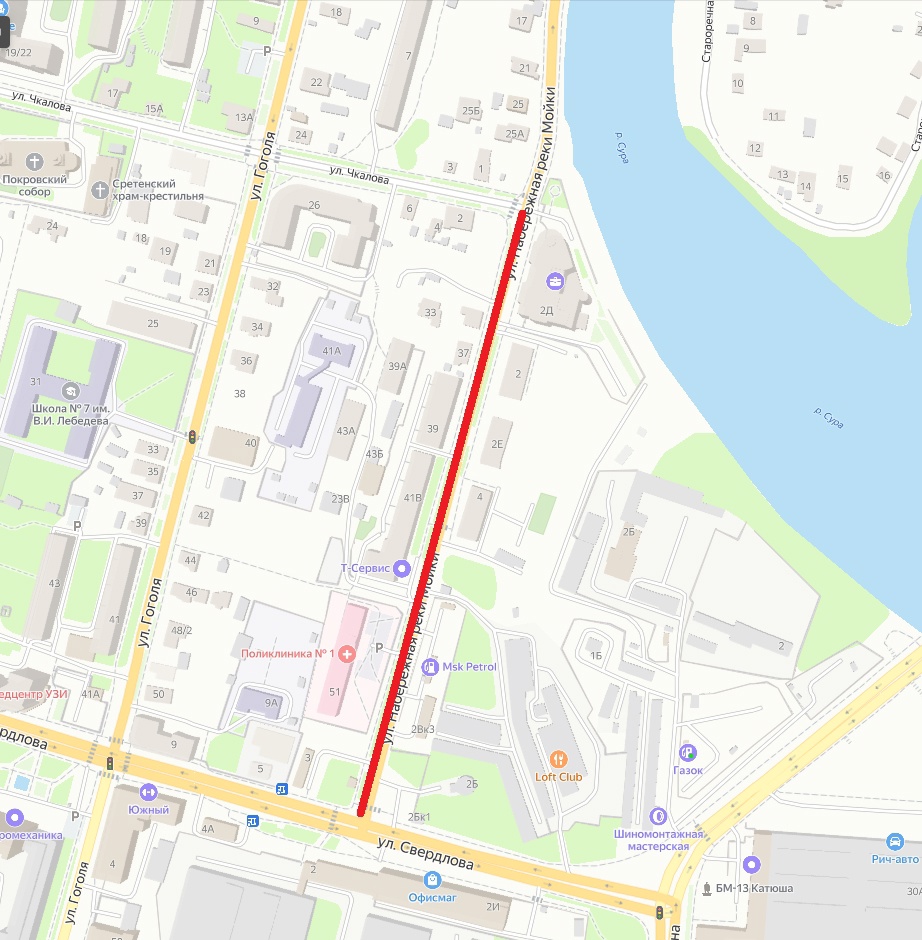 Движение будет закрыто от улицы Свердлова до улицы Чкалова в связи с проведением дорожных работ.