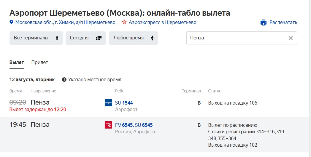 Следующий рейс из столицы в Пензу – FV6545 – пока планируется по расписанию, на 19:45, но ситуация может измениться.
