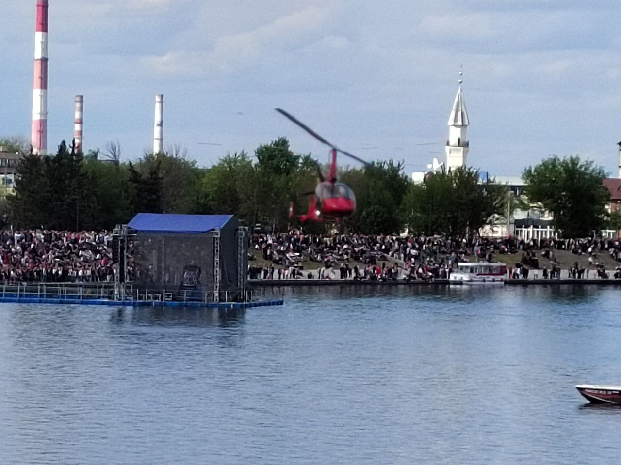 Третьим прилетел вертолет, который в районе сцены опустился максимально низко.