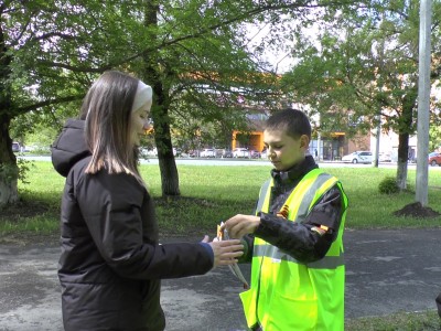 В честь памятной даты горожанам раздали георгиевскую ленточку и памятку-открытку по ее правильному ношению.