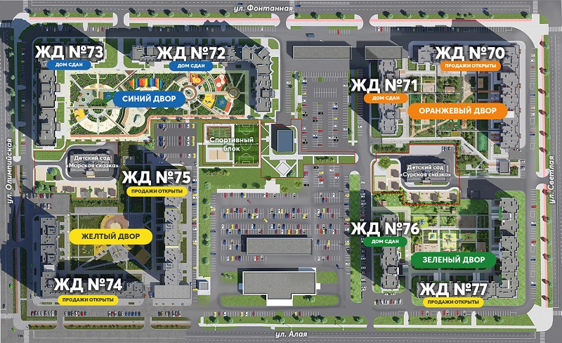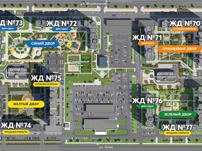 Здесь 4 двора и 8 домов. Синий двор построен, предприниматели уже активно развивают здесь свой бизнес. Куплены все коммерческие помещения на Фонтанной, 10 (Оранжевый двор), в строении № 75 (Желтый двор).