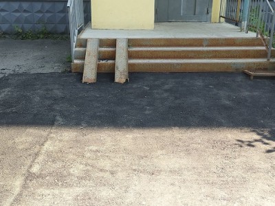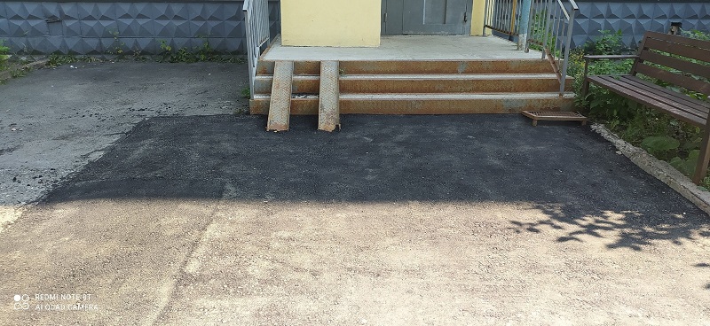 *Возле шестого подъезда дома №6 по улице Пушанина залатали асфальтом большую яму.