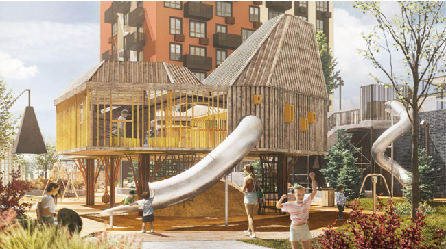 Зона для детей среднего и старшего возраста— это настоящий дом на дереве. Пространство, которое хочется исследовать, в котором игры придумываются сами собой. Лазательные оборудования, гамаки, большая горка в виде трубы, имитация рельефа для разных сценариев игр и подъема в «дом» и многое другое будет реализовано в «месте силы» младших жителей АРБЕРИ.