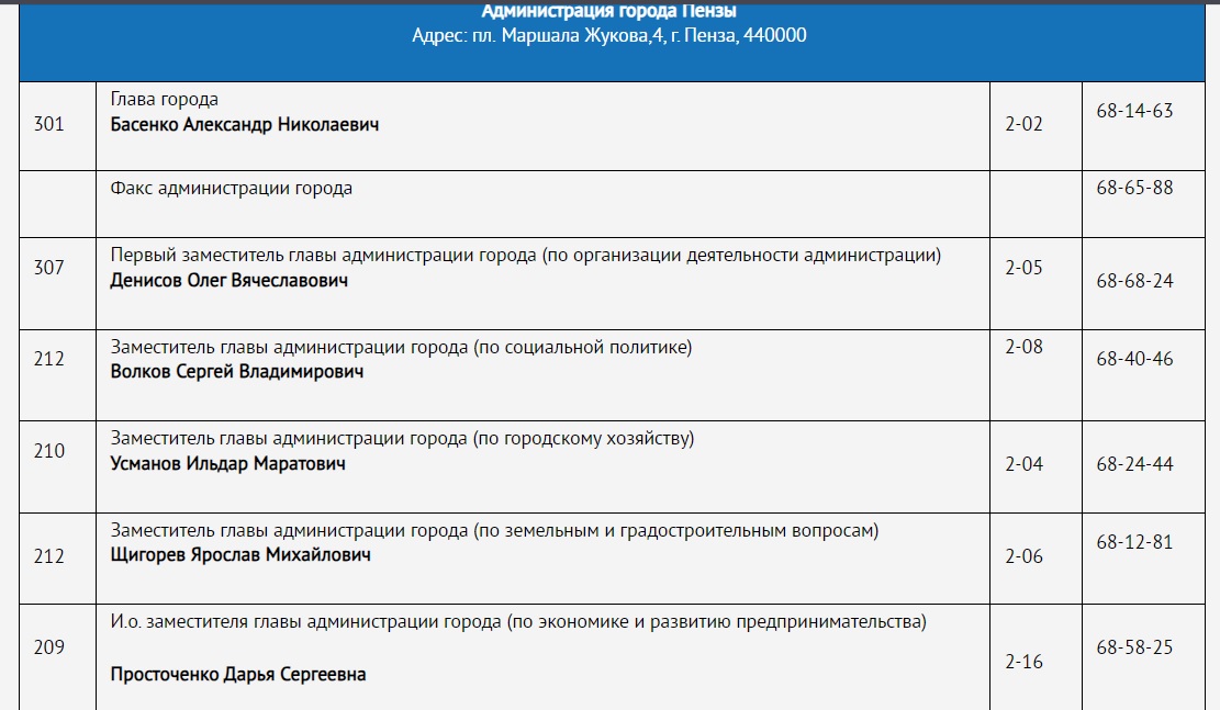 Сейчас заместителями главы города являются Олег Денисов, Сергей Волков, Ильдар Усманов и Ярослав Щигорев. Ранее пост одного из замов занимала Юлия Ляпина. 11 сентября 2024 года стало известно, что она ушла с этой должности. Теперь Ляпина возглавляет пензенский МУП по очистке города.