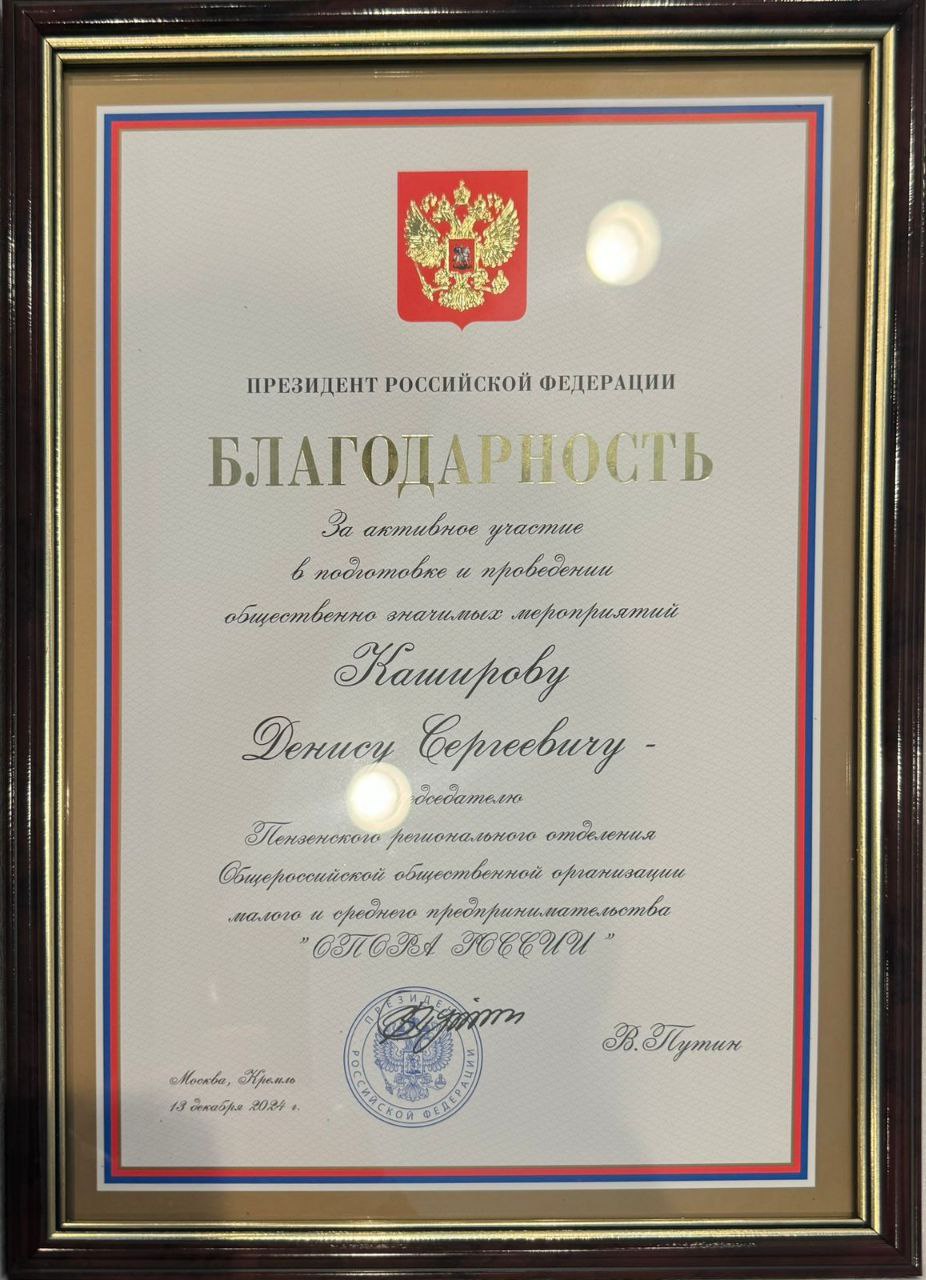 Председатель Пензенского регионального отделения «ОПОРЫ РОССИИ» Денис Каширов удостоен Благодарности Президента Российской Федерации Владимира Путина. Высокую награду он получил «за активное участие в подготовке и проведении общественно значимых мероприятий». Благодарность вручал лично руководитель Федеральной антимонопольной службы России Максим Шаскольский.