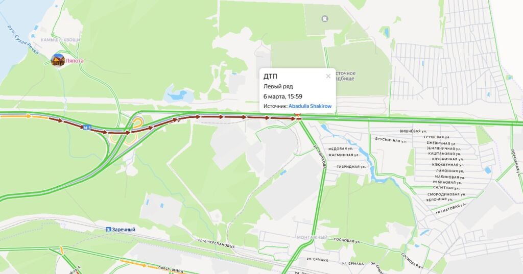 Онлайн-карты подтверждают слова горожан: проблемный участок окрасился в темно-бордовый цвет. Судя по навигаторам, ситуацию серьезно осложнила авария, которая произошла в левом ряду и практически перекрыла свободный проезд.