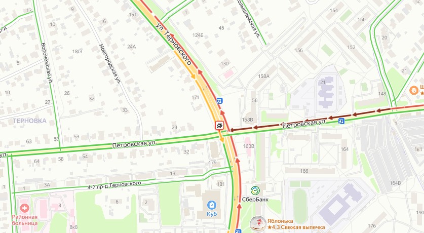 Сервисы мониторинга дорожной ситуации отмечают затруднение движения в районе аварии, указывая на то, что ДТП произошло в правом ряду.