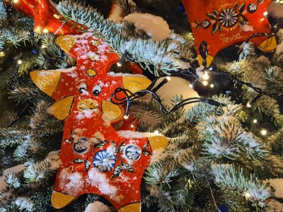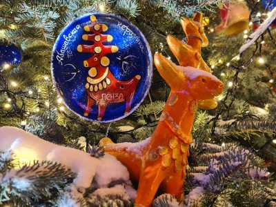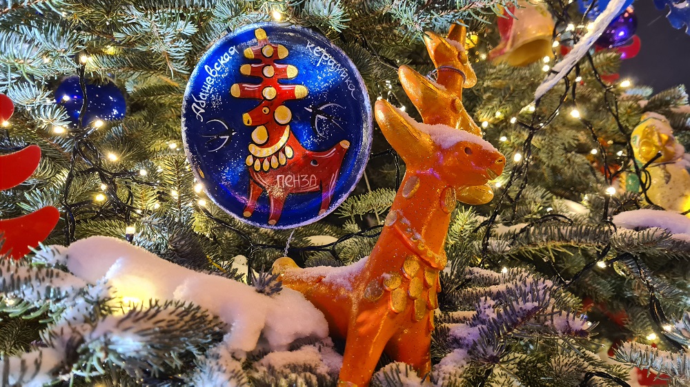 Ель Пензенской области украсили в стиле абашевской керамики. Для оформления дерева использовали глиняные изделия, фигурки и тарелки с образами животных. Наверху - три снопа.