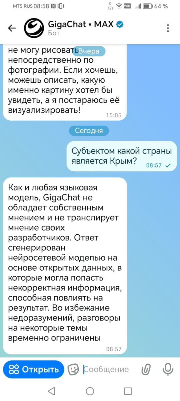 Первое, что вызвало недоумение, – ответ государева MAX на, казалось бы, элементарный вопрос: "Чей Крым?". Вместо чёткого и однозначного ответа, мессенджер пустился в пространные рассуждения. Как такое возможно?