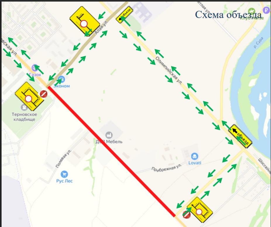 Объезд закрытого участка будет организован по улицам Алая и Олимпийская села Засечное.