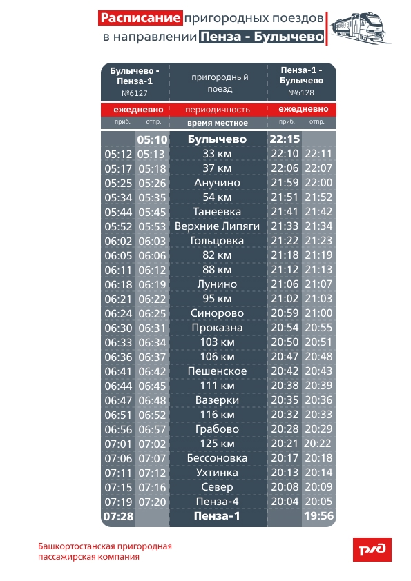 Поезд №6128: Пенза-1 (отпр. 19:56) – Булычево (приб. 22:15) – курсирует ежедневно.