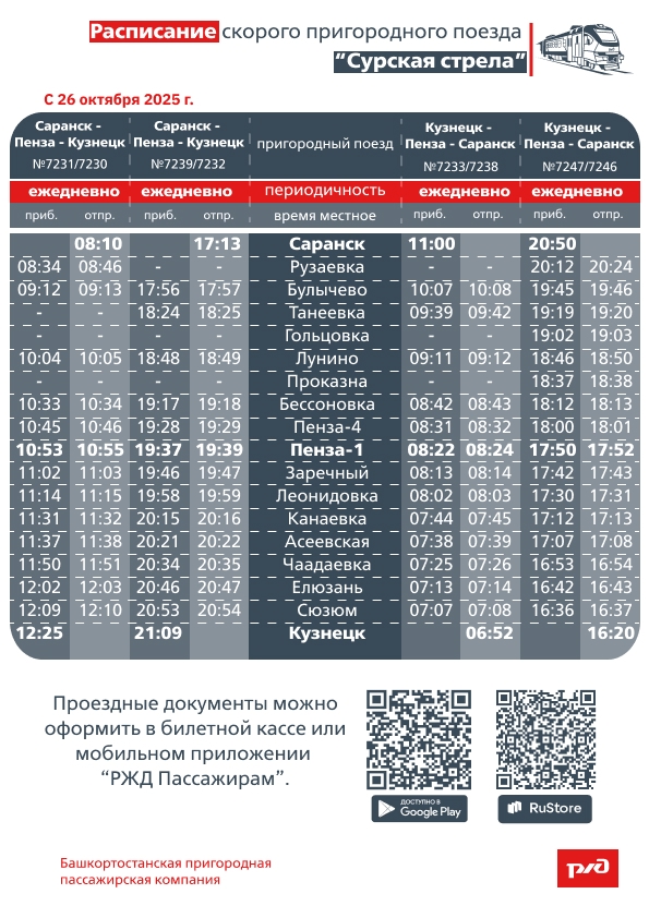 АО «Башкортостанская ППК» информирует пассажиров о важных изменениях в графике движения пригородных межрегиональных поездов. С 26 октября 2025 года вступают в силу новые расписания маршрутов «Сурская стрела», следующих по направлению Кузнецк – Пенза-1 – Саранск, а также состава Пенза-1 – Булычево.