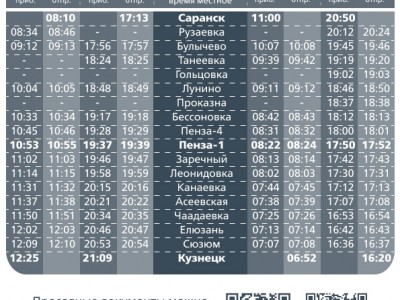 Поезд №7247/7246 (утренний рейс): Кузнецк (отпр. 06:52) – Пенза-1 (приб. 08:22, отпр. 08:24) – Саранск (приб. 11:00). В этом маршруте назначается дополнительная остановка Танеевка, а остановка в Рузаевке отменяется.