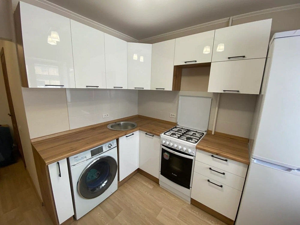 Темный гарнитур визуально «съест» часть пространства в и без того маленьком помещении. Это в первую очередь справедливо для ситуаций, когда гарнитур угловой и шкафы выполнены под потолок — темная отделка сделает такую мебель чересчур громоздкой. Белые, бежевые и светло-коричневые оттенки — идеальный выбор для отделки фасадов в небольшой кухне. Лучший вариант для фасадов в этом случае — глянцевая эмаль.