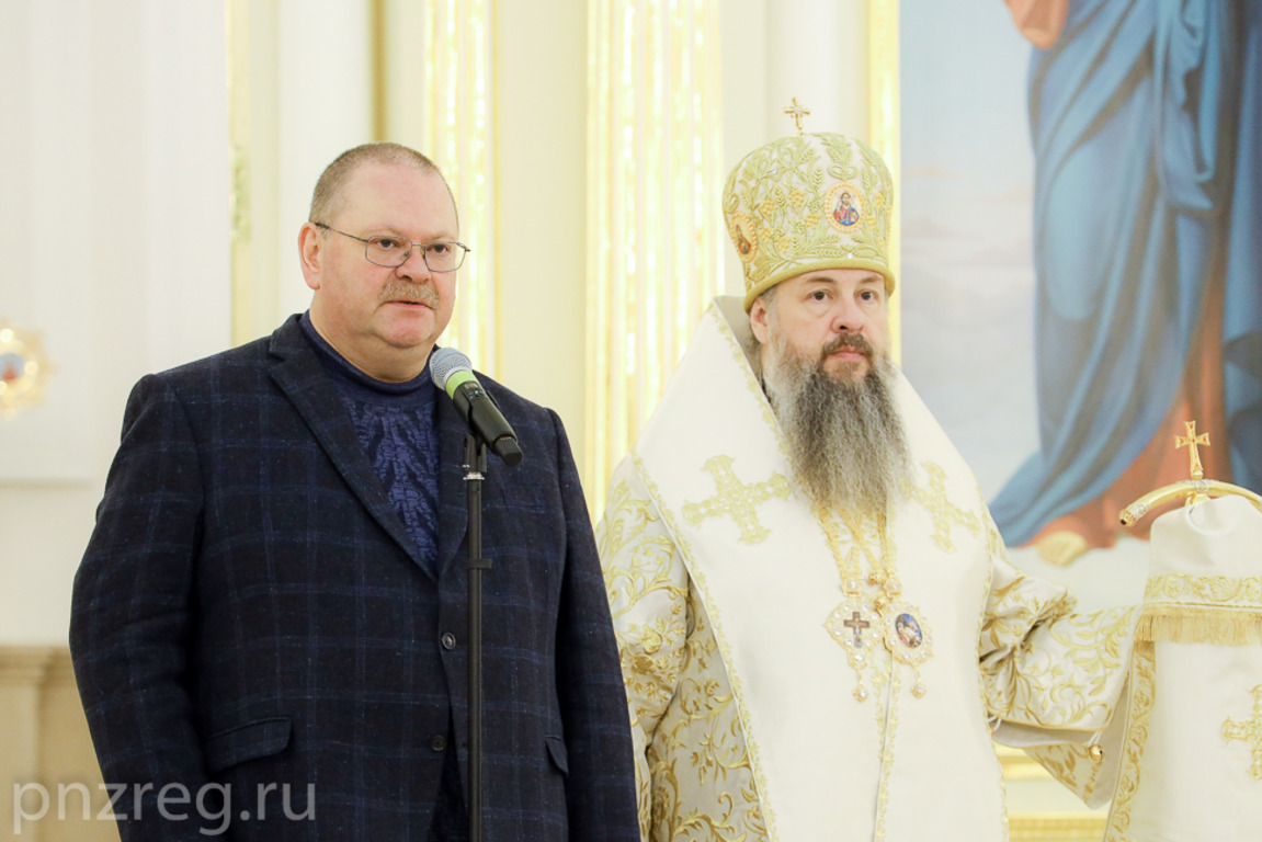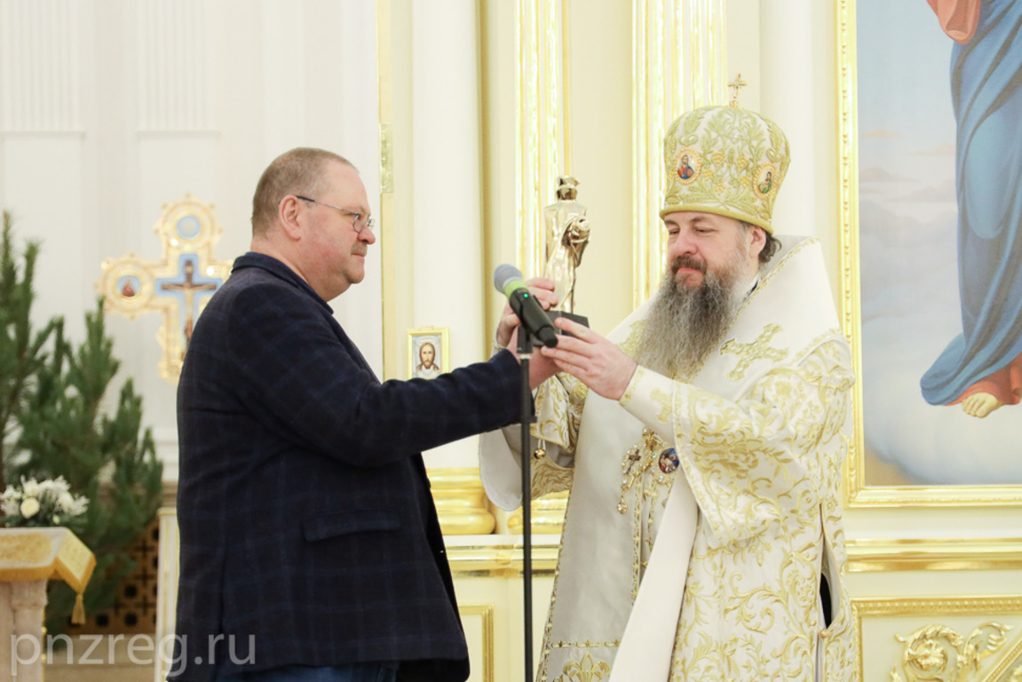 Олег Мельниченко передал Владыке Серафиму приз международной архитектурной премии «Золотой Трезини», его поместят в музей пензенской митрополии. Кроме того, глава региона подарил храму дарохранительницу с изображением Спасского кафедрального собора.