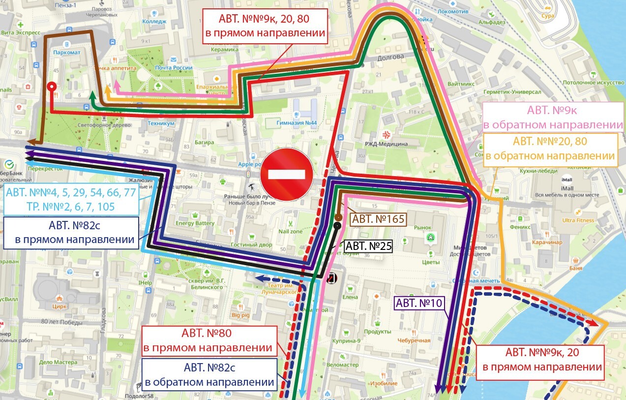 Изменения коснутся и маршрутов №№ 9к, 20, 80. Они будут следовать через Московскую, Долгова и Чехова, а в обратную сторону – через Суворова, Урицкого, Долгова и Московскую.