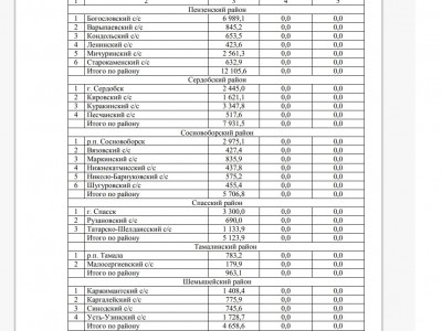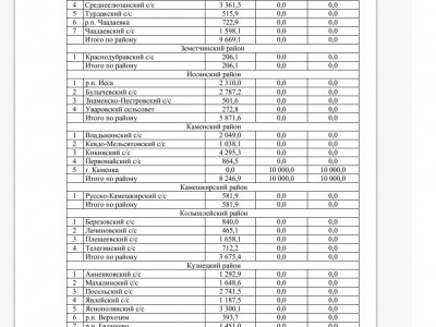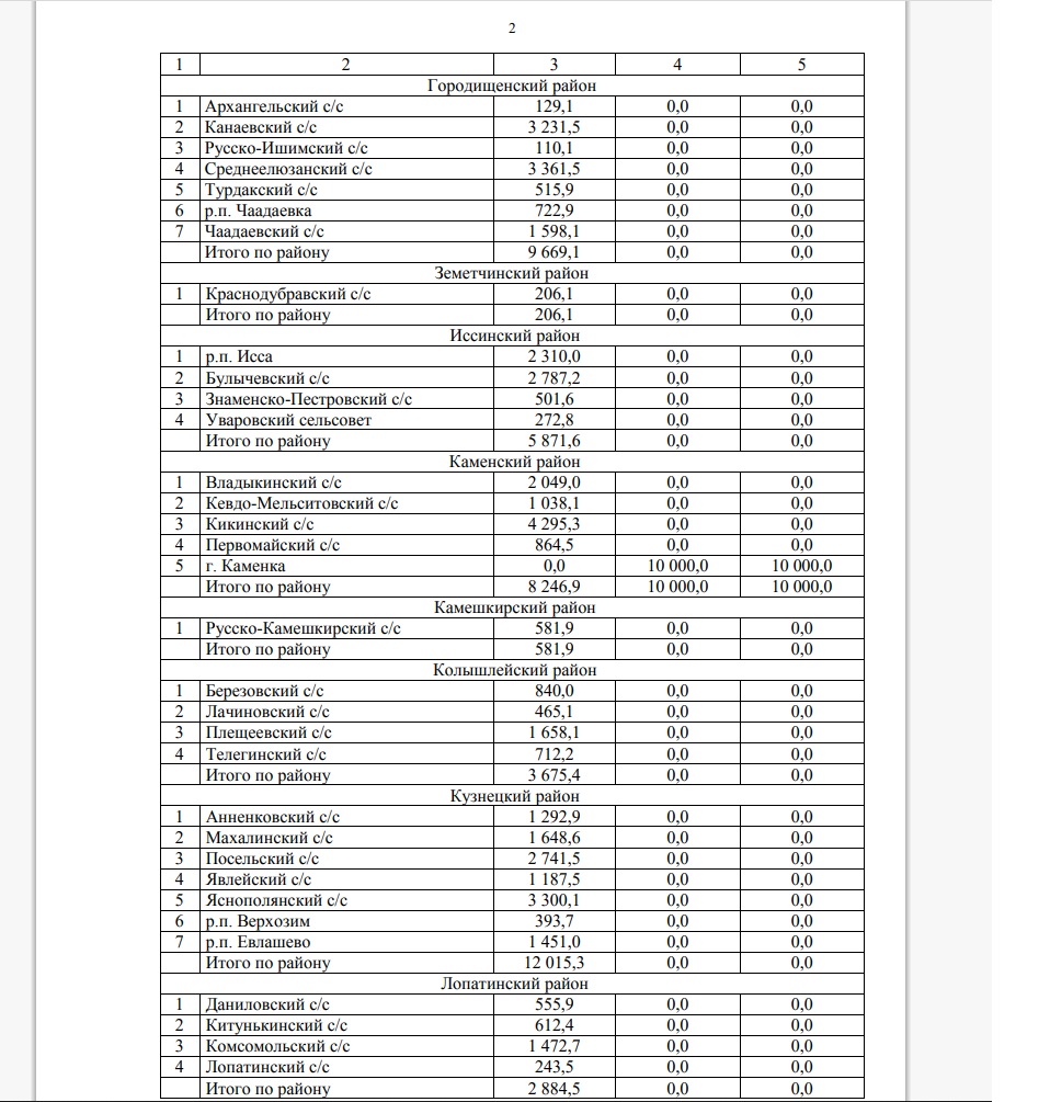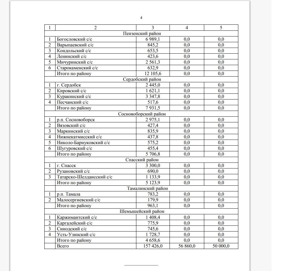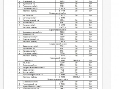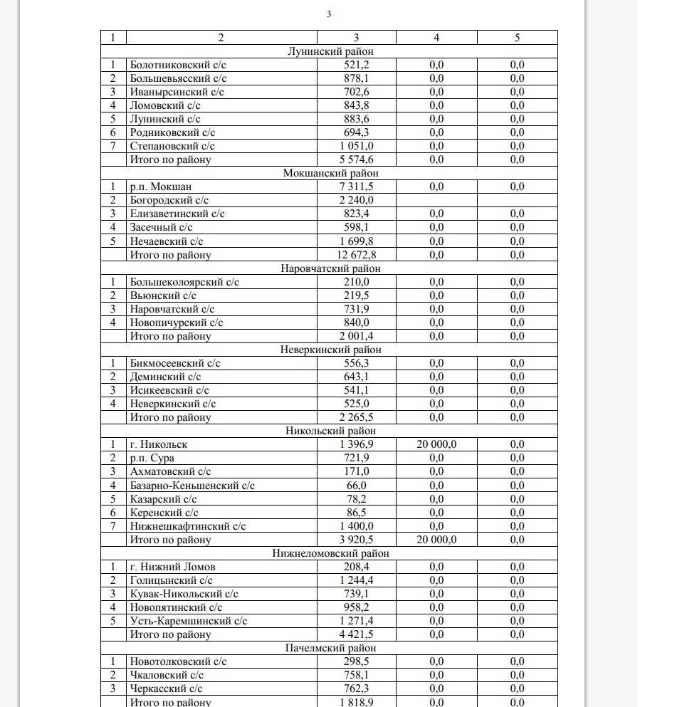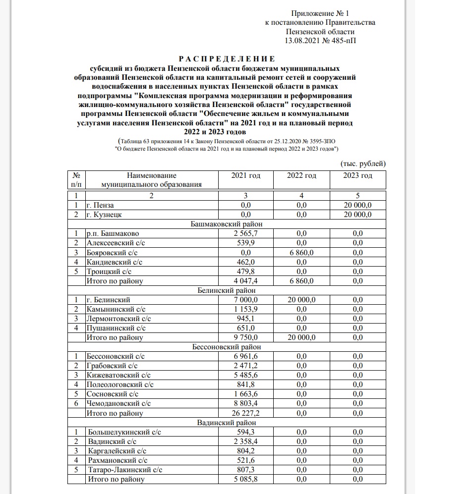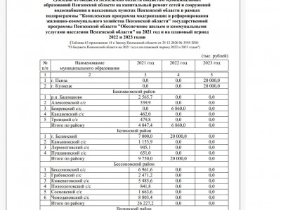 В документации указана таблица, в которой по районам Пензенской области распределены субсидии на капремонт сетей водоснабжения на 2021, 2022 и 2023 годы. Так, в текущем и следующем году ни Пенза, ни Кузнецк не получат субсидий, однако в 2023 году этим двум городам выделят по 20 000 рублей. Сердобский район наоборот получит финансирование в 2021 году, но не получит его в последующих годах. Запланировано, что в 2021 году в район направят 7 931,5 рубль.